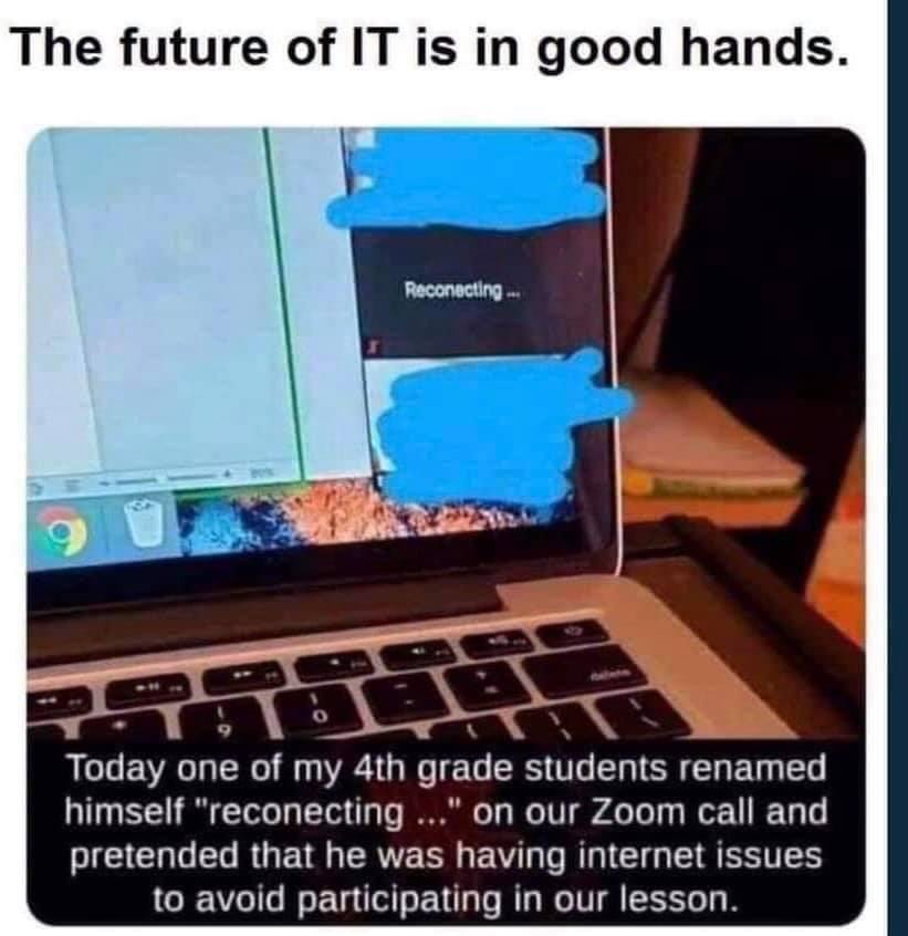 Finally, here’s a good one to end with on April Fool’s Day. A teacher posted a screenshot of his or her laptop from a remote learning session with students, and explained, “Today one of my 4th grade students renamed himself ‘reconecting…’ on our Zoom call and pretended that he was having internet issues to avoid participating in our lesson.” Beautiful.